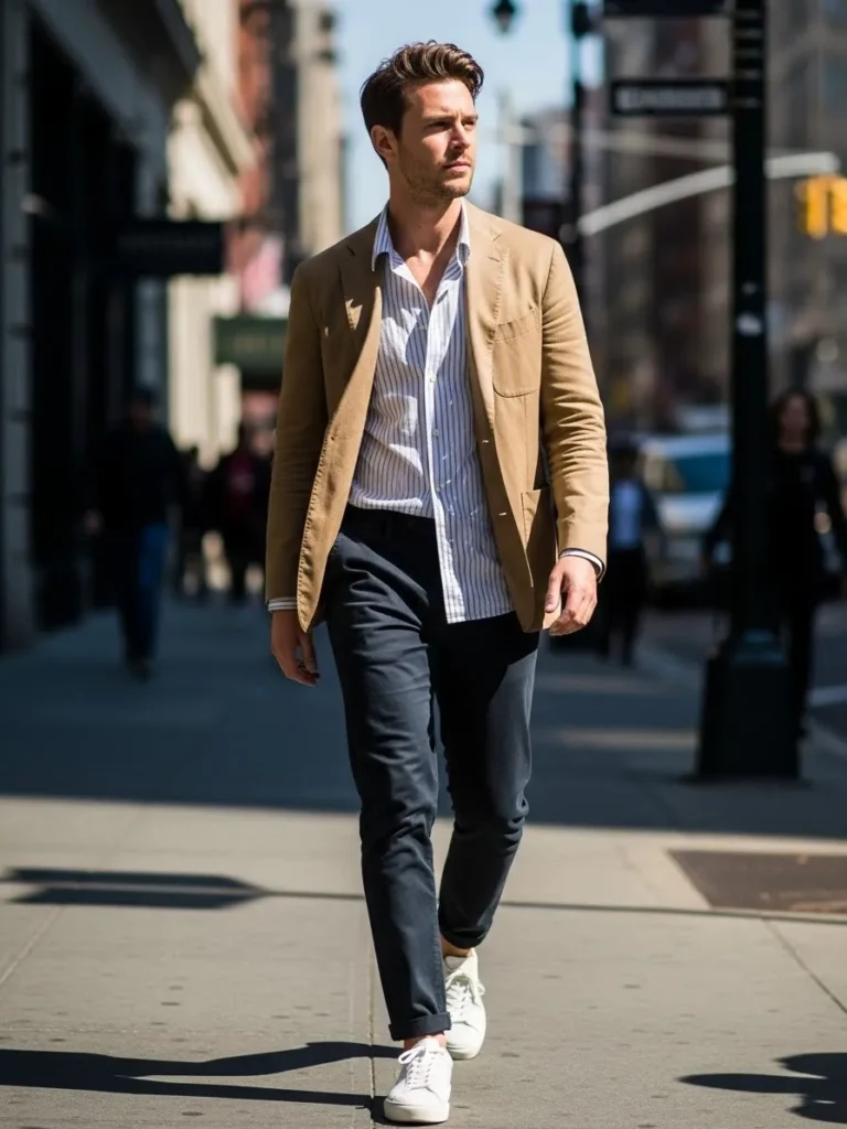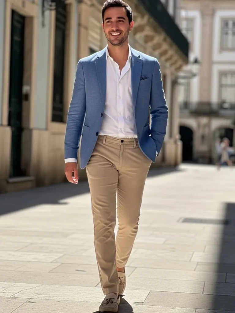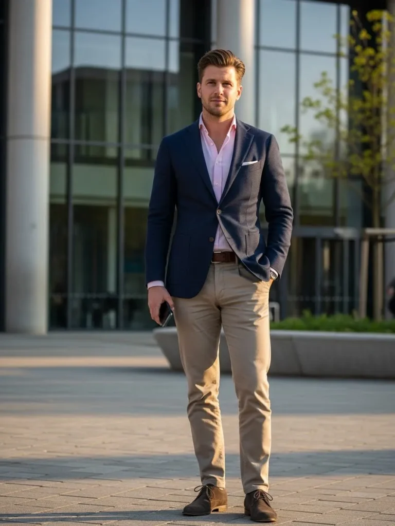 This outfit pairs a sharp navy blazer with a crisp white shirt and classic khaki trousers. The brown leather shoes add warmth and keep the look grounded. Everything feels tailored but still relaxed which makes it perfect for spring days in the city.