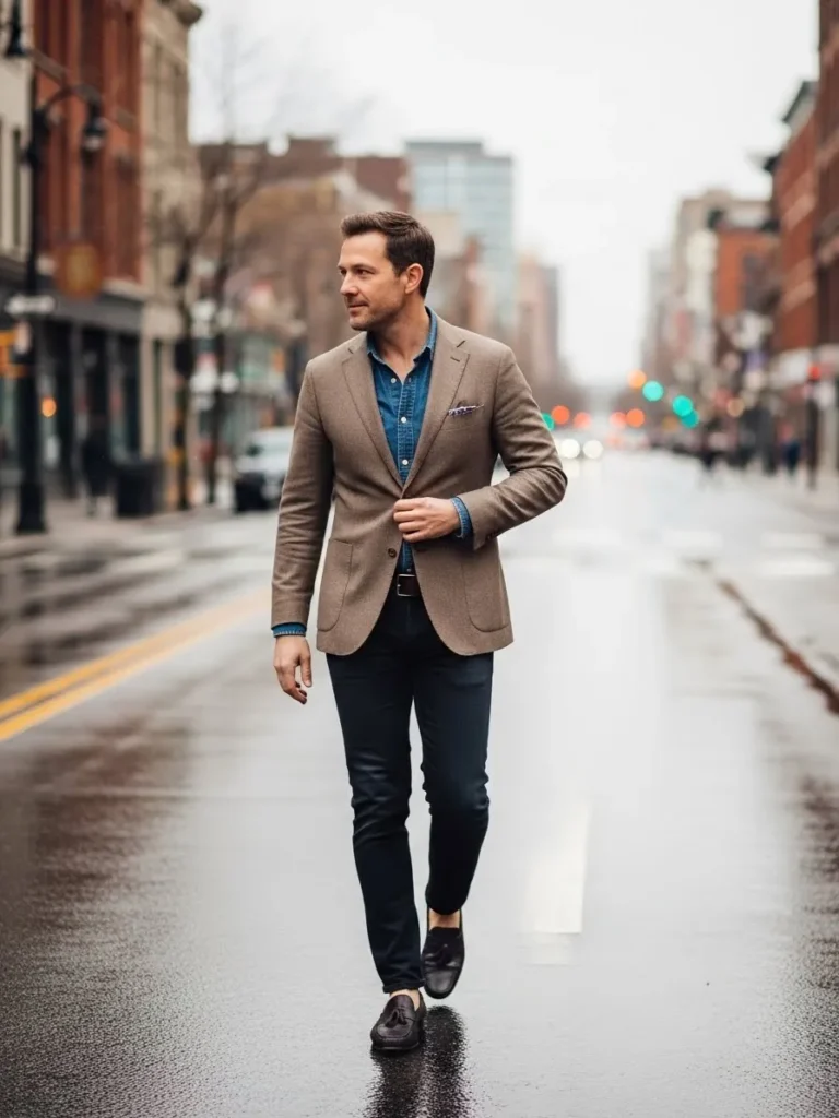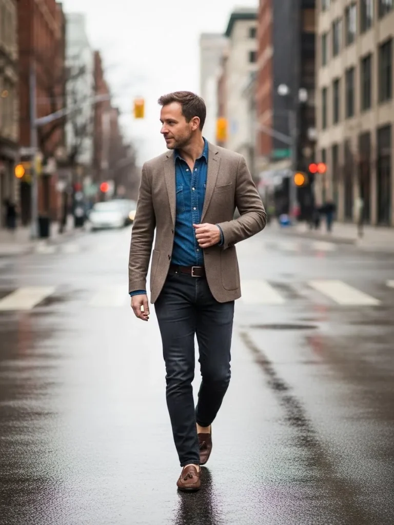 • Brown Blazer With Blue Shirt And Dark Jeans
