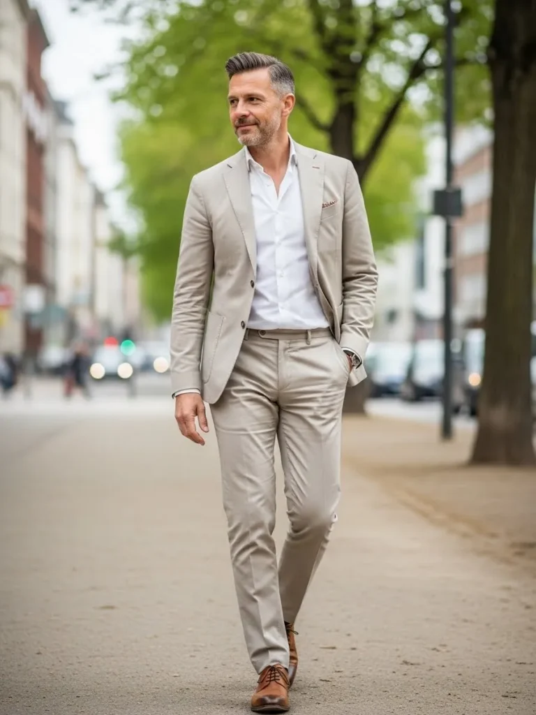 A light beige suit paired with a white open collar shirt creates a fresh and airy spring look. The tailoring is clean and the soft color palette keeps everything light. Brown leather shoes add just enough contrast to finish it off.