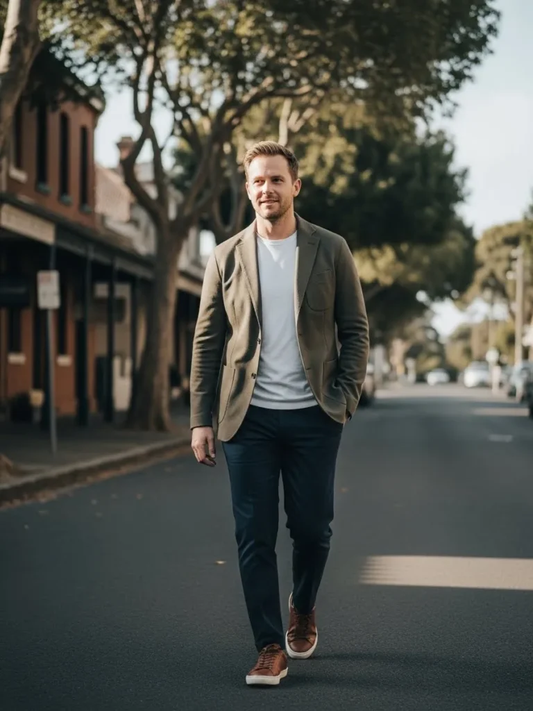 Here we see a casual blazer layered over a simple crew neck tee paired with dark jeans and brown shoes. The fit is relaxed but still clean. The overall look feels modern and wearable with just enough structure.
