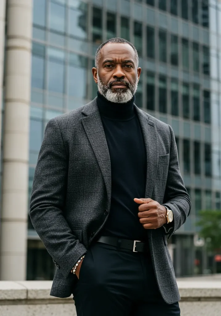Here we see a sharp grey checkered blazer worn over a black turtleneck and matched with dark tailored trousers. The outfit is elevated with sleek accessories like a classic wristwatch and a subtle bracelet, perfect for a city backdrop of glass towers.