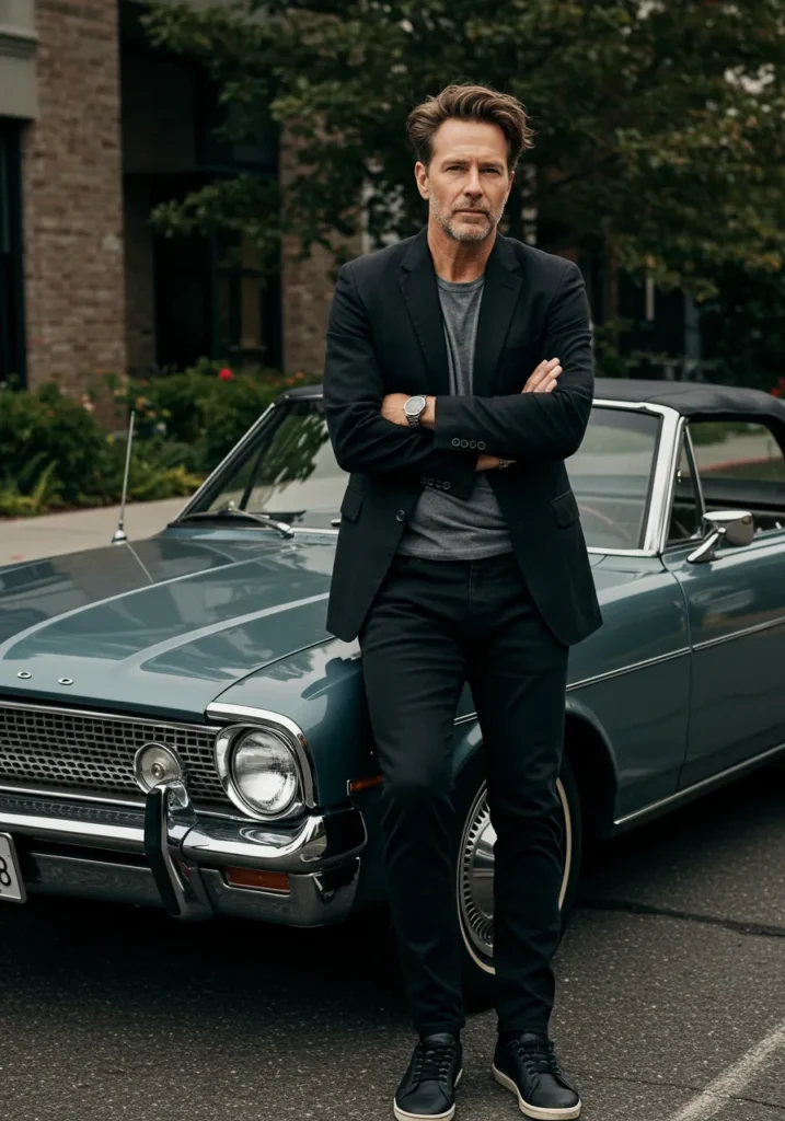 This outfit features a fitted black blazer layered over a simple grey tee, styled with slim black jeans and dark sneakers. The man stands confidently with arms crossed in front of a classic convertible, adding an unmistakably cool, timeless vibe.
