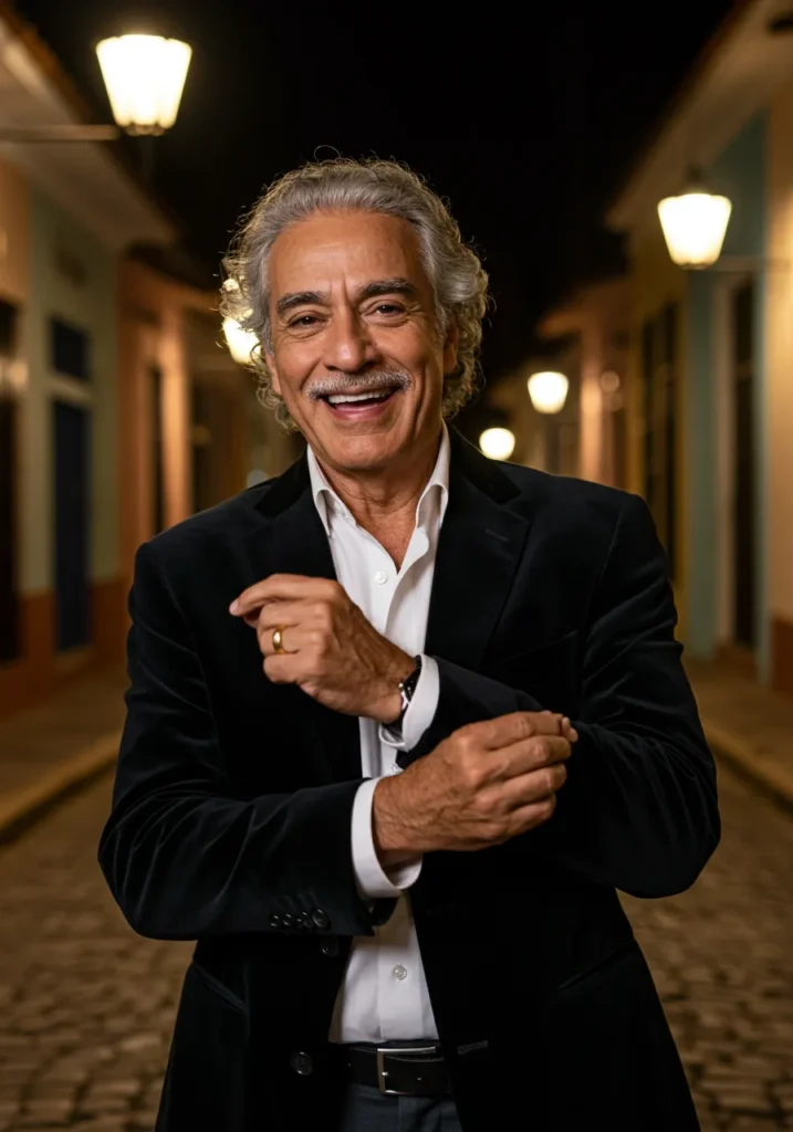 Here we see a sleek black velvet blazer worn over a crisp white shirt and tailored trousers. The man’s silver hair and easy smile, combined with the glowing street lamps of a night scene, give the look a warm and charismatic feel.