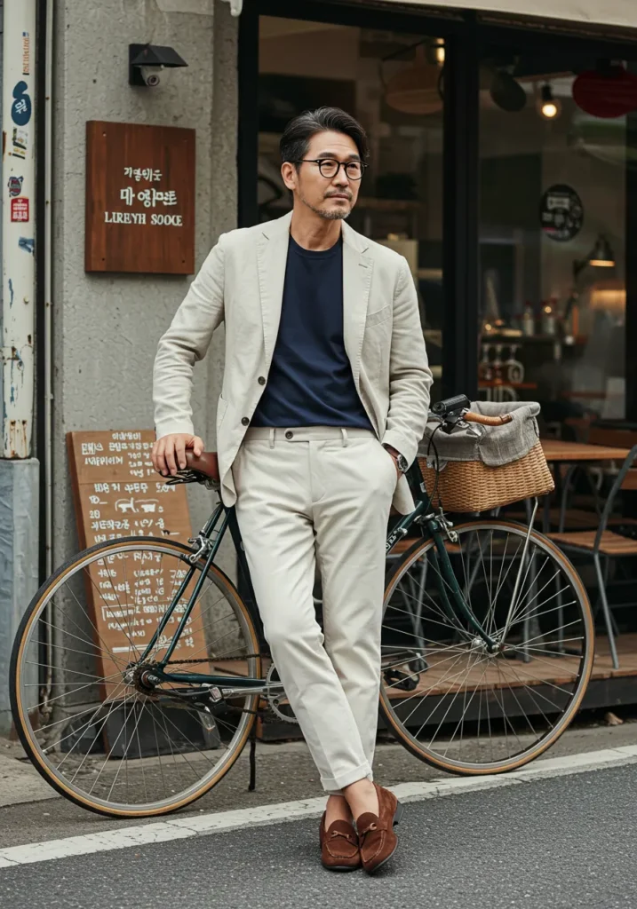 This outfit features a light beige blazer paired with matching trousers and a navy t-shirt, finished off with brown loafers. The man leans casually against a vintage bicycle outside a café, with his glasses adding an intellectual and relaxed touch.
