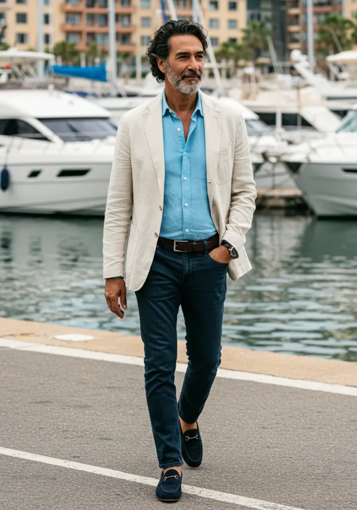 This ensemble features a light beige linen blazer paired with a sky-blue button-down shirt and dark slim-fit jeans. The look is finished with navy loafers and a relaxed confidence that fits the marina setting with yachts in the background.