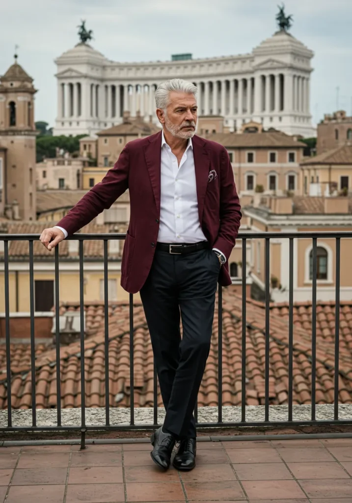 This outfit shows off a rich burgundy blazer layered over a crisp white dress shirt, paired with tailored black trousers and polished shoes. A pocket square adds a refined detail, and the rooftop view of Rome enhances the sense of timeless elegance.