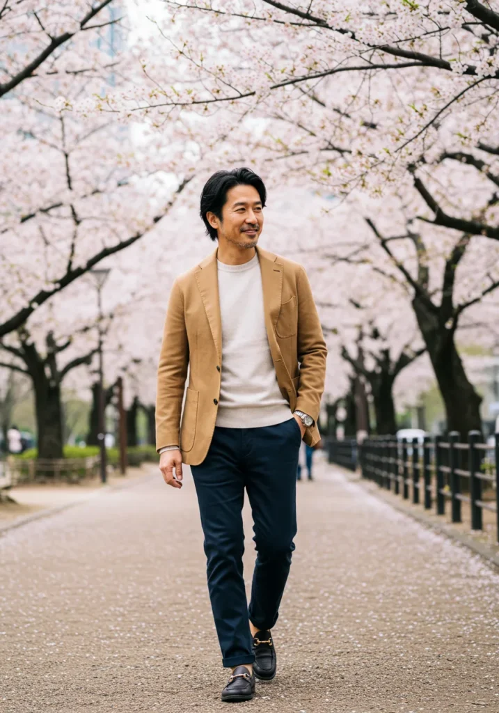 This look combines a camel-colored blazer with a soft cream sweater, navy trousers, and dark loafers. The backdrop of blooming cherry blossoms creates an atmosphere of effortless style and seasonal charm.