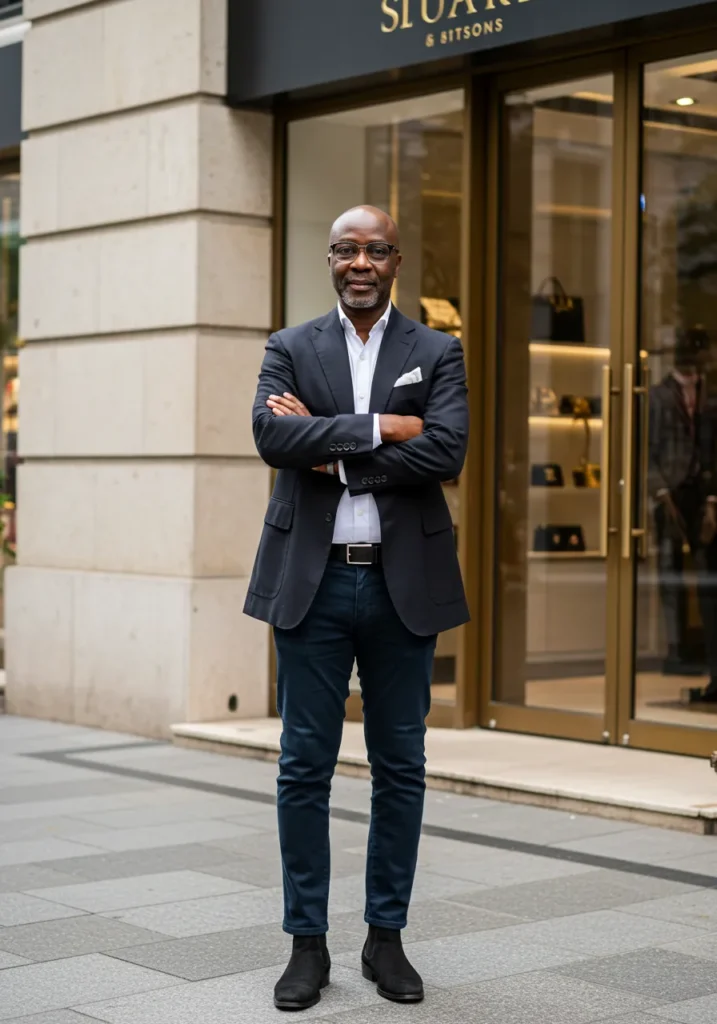Here we have a sleek navy blazer worn over a crisp white shirt, styled with dark slim trousers and polished black boots. The pocket square detail adds sophistication, while the relaxed stance in front of chic boutiques makes the outfit feel approachable.