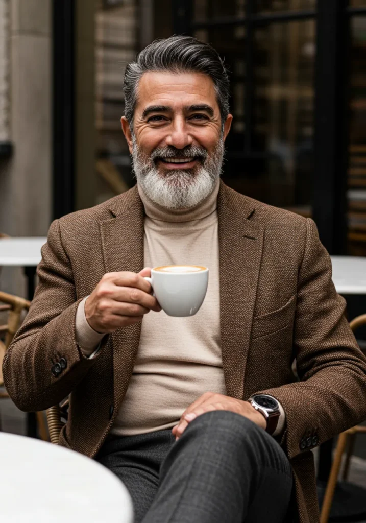 This outfit features a warm brown textured blazer layered over a beige turtleneck, paired with tailored dark trousers. The look is accessorized with a sleek watch, and the man’s silver hair and full beard add an extra touch of charm. The coffee cup in hand gives the whole scene a relaxed yet polished café vibe.