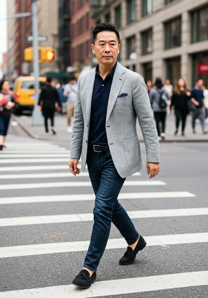 This look showcases a light grey blazer styled with a dark navy polo shirt and dark wash jeans. Black loafers complete the outfit, while a pocket square peeks subtly from the jacket for a polished touch. The busy city street backdrop adds movement and energy.