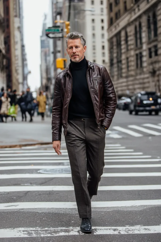 I absolutely adore how this outfit plays with different shades of brown and textures! The combination of the slightly distressed leather jacket with the refined woolen trousers is just fantastic, mixing high and low elements perfectly. It feels incredibly flattering because the dark colors are inherently slimming, and the tailored fit of the pants instantly elevates the whole look. Plus, a black turtleneck is just one of those timeless pieces that screams classic elegance, making the man wearing it look immediately put-together and seriously chic—it’s just a total style win!
