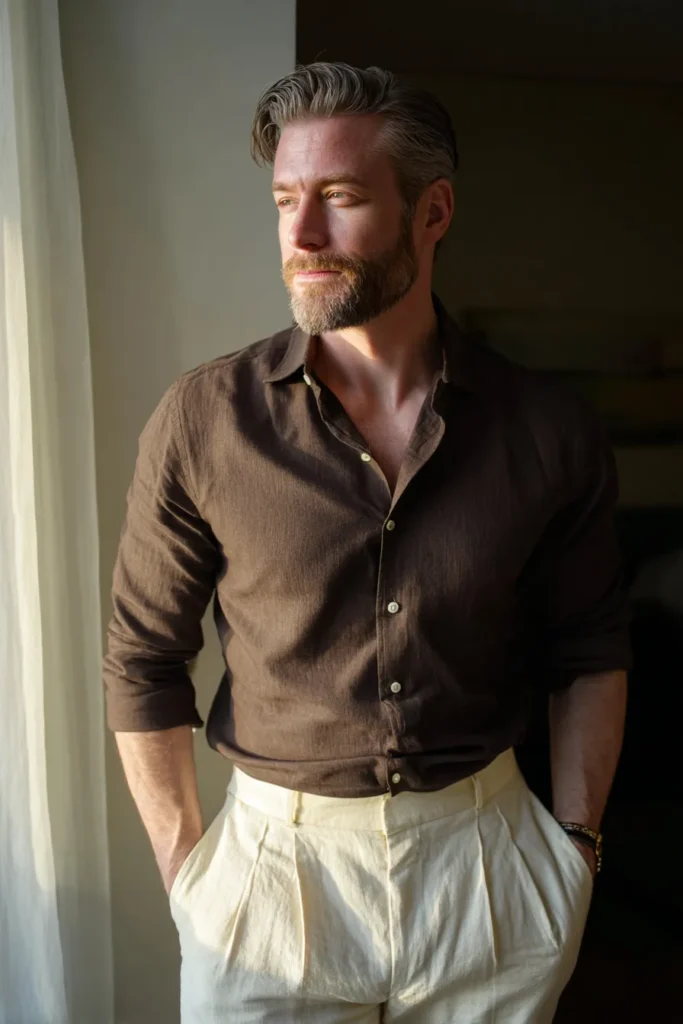 I am obsessed with this look because it’s so effortlessly chic while being incredibly comfortable, thanks to the linen fabric! The high contrast between the dark brown and the creamy white is so dramatic and flattering, giving the entire silhouette a defined shape and making the dark shirt really pop. The slight rumple of the linen material adds an element of relaxed maturity, proving that you can look utterly refined without wearing a sharp suit. It truly feels like the perfect outfit for a man who knows style and comfort go hand-in-hand—seriously stunning!