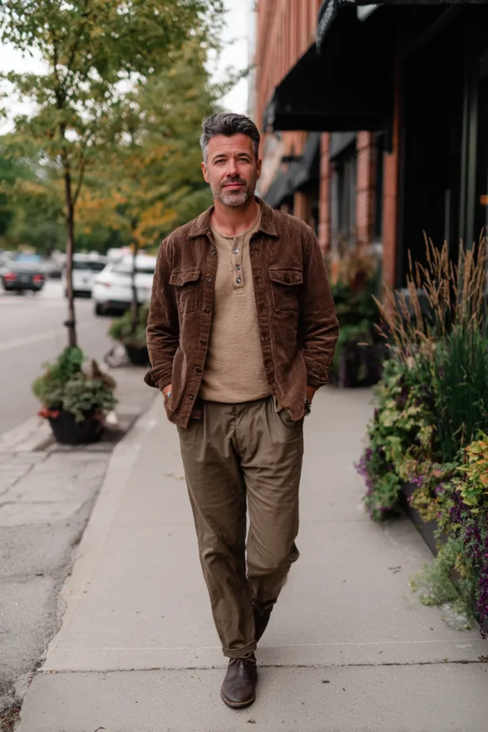 I really love how this look plays with different shades of brown and khaki—it makes the entire outfit feel incredibly harmonious and expensive! The corduroy is such a great choice for that mature, yet rugged texture, and pairing it with the softness of the Henley tee is just brilliant styling. The key to why it works so well is the tonal dressing; sticking to the same color family but varying the depth and texture creates a flattering, intentional look that’s not too flashy. It’s the ultimate cool-guy way to do casual and still look completely put-together—seriously, so chic!