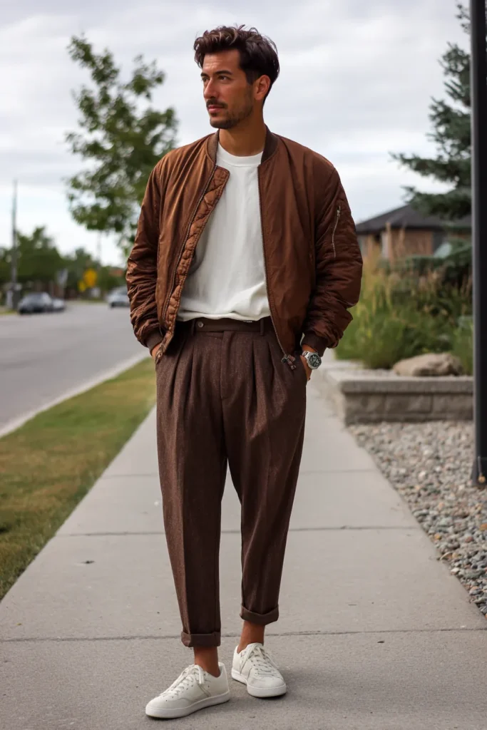 This outfit is a brilliant combination of sporty casual and tailored chic, mixing different silhouettes and textures for a modern street-style look. It features a sleek, slightly oversized bomber jacket in a gorgeous copper or burnt-orange brown, layered over a crisp white crew-neck t-shirt. The bottom half really elevates the look with high-waisted, pleated trousers in a deep, textured dark brown wool, which are stylishly cuffed at the ankle. Classic white leather sneakers tie the whole ensemble together, keeping the vibe cool, relaxed, and utterly fashionable.