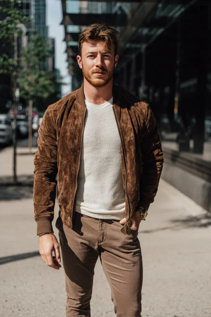 This casual yet luxurious look centers on beautiful texture and warm, earthy tones, making it perfect for a stylish day out. The jacket is the star—a gorgeous bomber in a rich, slightly distressed brown suede that adds immediate depth and tactile appeal. Layered beneath it is a light, cream-colored knitted crew-neck shirt with a wonderful subtle texture, providing a bright contrast to the outerwear. The outfit is completed with fitted trousers in a muted, medium brown or taupe color, keeping the overall tonal theme cohesive and effortlessly handsome.