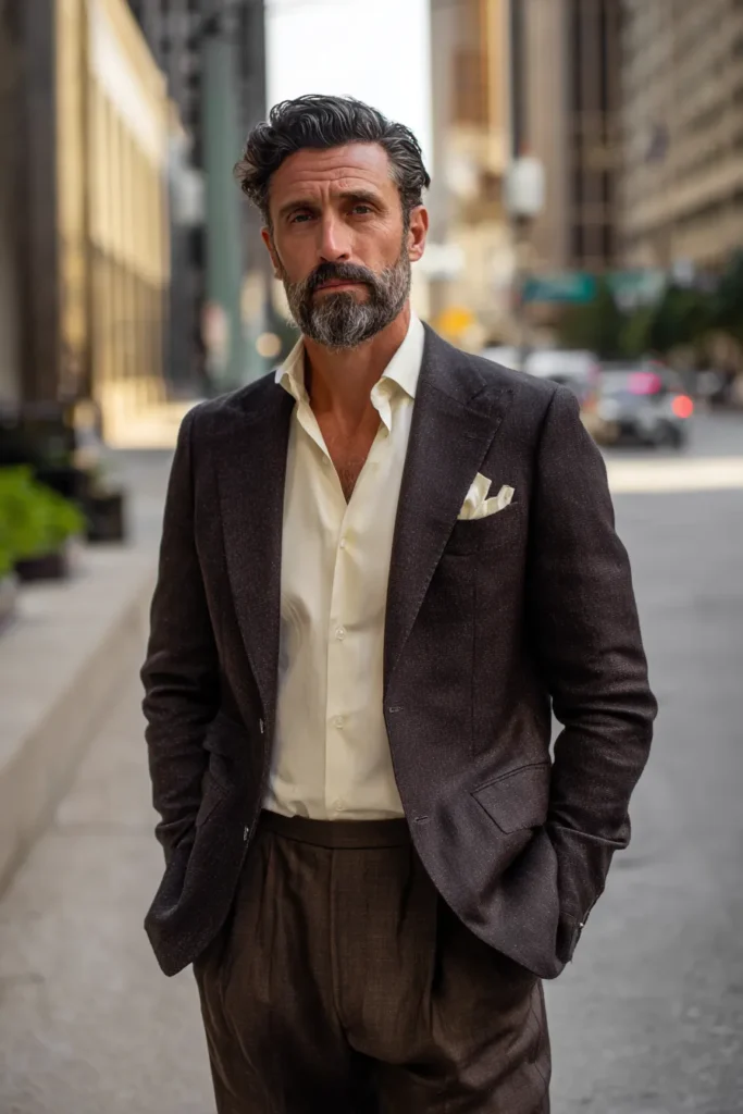 I seriously think this outfit is utterly chic because it’s such a smart, slightly unexpected take on a suit—it feels so much cooler than a standard black one! The subtle texture of the blazer and trousers makes the dark brown feel rich and luxurious, and I absolutely adore how the pale shirt provides a soft, flattering contrast right near the face. The open collar keeps the whole thing from feeling stuffy, giving it a relaxed, almost Italian vibe that is instantly mature and effortlessly handsome. It’s a perfect example of how choosing quality fabrics and subtle earthy tones can make an ensemble look incredibly expensive and timeless!