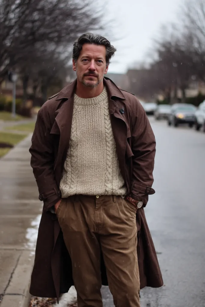 This ensemble is the perfect mix of classic rainy-day style and cozy country gentleman vibes, utilizing warm earth tones beautifully. The main layer is a traditional trench coat in a rich, dark brown, which adds a structured and timeless silhouette. Underneath, a thick, cream-colored cable-knit sweater provides gorgeous texture and comfort, instantly softening the look. The trousers are a nice mid-tone brown corduroy or cotton, and the entire outfit feels grounded, warm, and ready for a stylish stroll, even in damp weather.