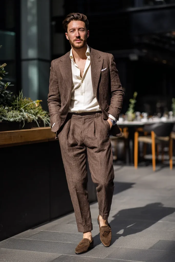 This is the ultimate look for a sophisticated summer or warm-weather event, embracing the breathable elegance of brown linen. The ensemble features a relaxed, unstructured suit in a gorgeous deep cocoa brown with a subtle textured finish. It includes a single-breasted blazer and high-waisted, pleated trousers that are stylishly cuffed at the ankle. Layered underneath is a crisp, off-white button-down shirt left open at the collar for a relaxed feel, and the outfit is completed with dark brown suede slip-on loafers, giving it a cool, European flair.