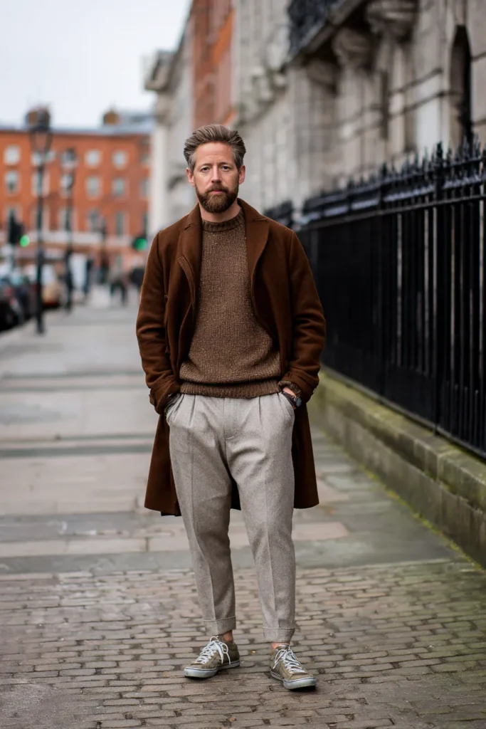 I honestly think this combination is so effective because of the high contrast—it’s just such a simple styling trick that looks instantly chic and flattering! The rich, dark brown knit feels warm and masculine, and when paired with the light, relaxed trousers, the whole silhouette just pops. It’s a great example of how you don’t need fussy layers or accessories to look incredibly mature and put-together; sometimes, the best outfits are just two beautiful, contrasting pieces. This is a look that feels effortlessly stylish and comfortable for everyday wear—seriously perfect!