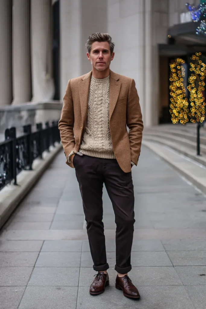 This outfit is the definition of smart casual sophistication and it screams perfect autumn or winter layering. It features a lovely camel-colored tweed or wool blazer with a great texture, worn over a chunky cream-colored cable-knit sweater for maximum coziness. The look is grounded by deep, chocolate brown chinos that are neatly cuffed at the ankle, which is a great little styling detail. A pair of rich, polished brown leather lace-up shoes completes this earthy and classy ensemble, balancing comfort with timeless style.