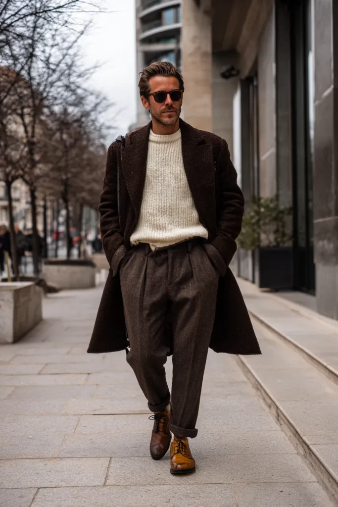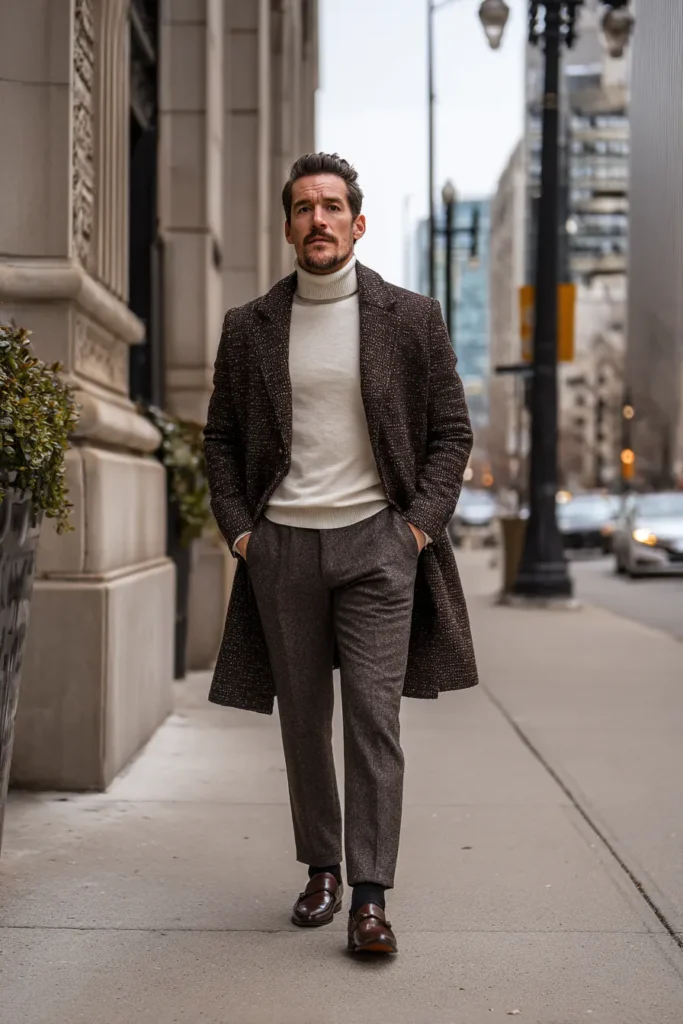 This is an incredibly sharp and sophisticated winter ensemble that’s perfect for a city outing. The focal point is a gorgeous knee-length overcoat in a dark, speckled brown tweed, giving it that luxurious, textured feel we all love. Layered underneath is a creamy off-white turtleneck sweater that brings a welcome brightness to the darker outerwear. The look is grounded by relaxed-fit trousers in a charcoal or medium brown wool, and it’s finished off with a pair of sleek, dark brown leather loafers—a total power pairing for a polished look.