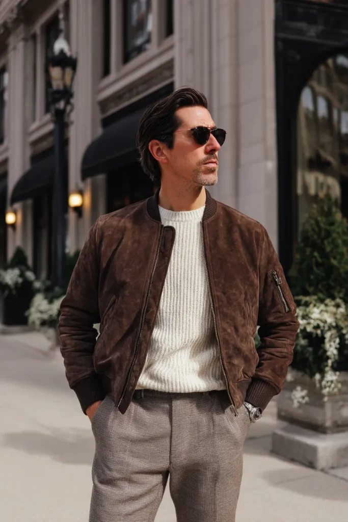 This look is the definition of sophisticated weekend style, balancing rich texture with a refined pattern. The centerpiece is a luxurious bomber jacket in a gorgeous chocolate brown suede, which instantly elevates the whole ensemble with its soft, rich feel. It’s layered over a textured crew-neck sweater in a creamy off-white, providing a beautiful contrast against the dark jacket. The lower half features expertly tailored trousers in a muted gray-brown check pattern, and the whole outfit has a cool, modern, and mature energy that’s perfect for city life.