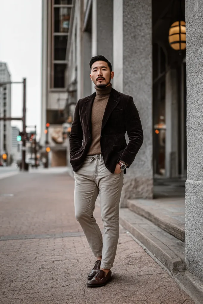 This outfit is the perfect example of mixing rich textures with light neutrals for a sophisticated urban look. The centerpiece is a dark, chocolate brown corduroy blazer that brings a fantastic tactile element and structure to the upper body. It’s layered over a warm, mid-tone camel turtleneck sweater, providing a beautiful tonal transition from the darker jacket. The lower half offers a great contrast with slim-fit trousers in a pale gray or stone color, and the whole ensemble is smartly finished with polished dark brown loafers, giving it a cool, contemporary elegance.
