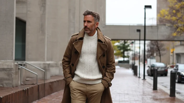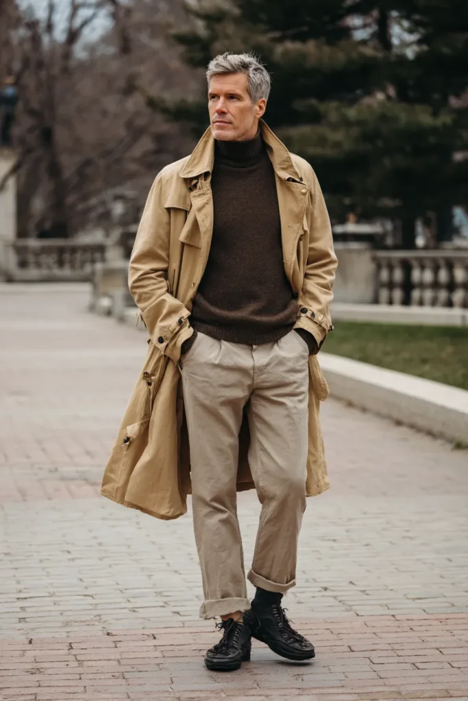 I truly love how this outfit feels both traditionally elegant and modernly rugged—it’s such a cool mix! The dark brown turtleneck is such a genius choice under the trench because it looks instantly flattering, highlighting the face and creating a defined neckline. The contrasting light trousers and darker upper half create a beautiful balance that keeps the longer coat from feeling too heavy. Pairing a classic piece like the trench coat with those slightly unexpected, heavier boots gives the whole ensemble a confident, mature, and stylishly unexpected finish—it’s just a fantastic way to dress for cooler weather!