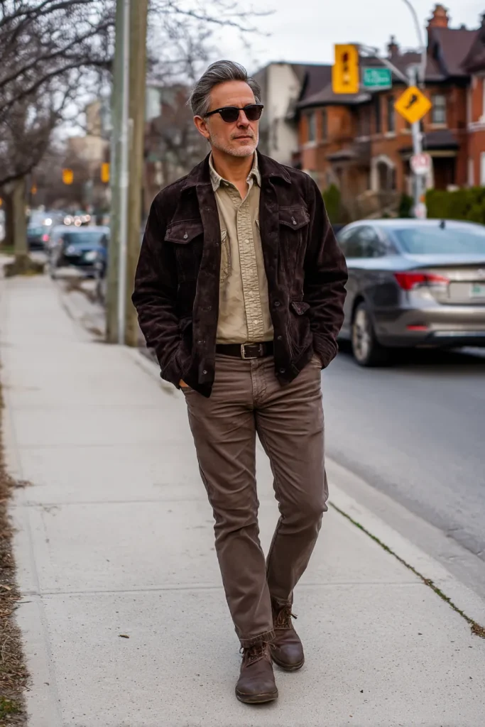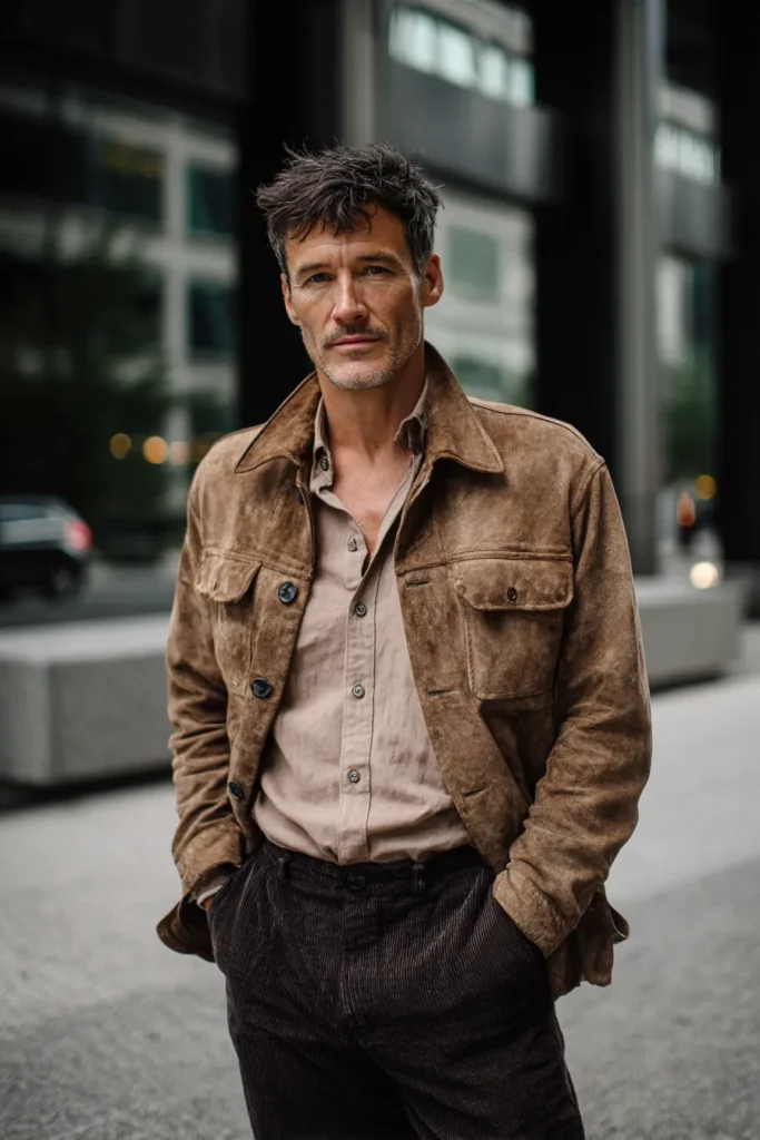 I really love how this outfit plays with different tactile materials—the soft suede jacket against the ribbed corduroy pants is just genius for adding depth! Sticking to the same earthy color family but varying the textures is what makes this look so expensive and effortlessly chic. The slightly lighter shirt worn open is also a great styling detail because it keeps the overall dark color scheme from feeling too heavy and adds that relaxed confidence. This is a brilliant example of how choosing quality fabrics and keeping the colors tonal instantly elevates even the most casual layered pieces—a true style winner!