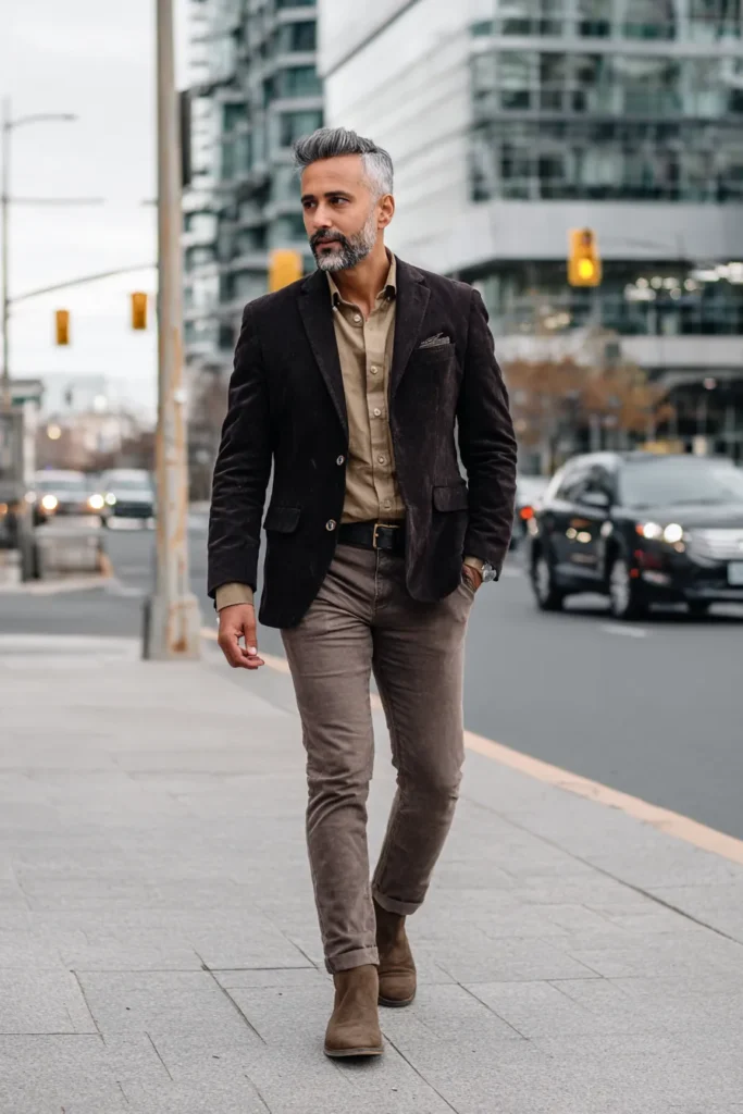 I absolutely think this outfit works like a dream because it plays so well with varying textures and shades of brown! The corduroy blazer and the suede boots give the look an expensive, tactile feel, making it instantly chic. Using a darker blazer and keeping the tones for the shirt and pants lighter creates a flattering balance that draws the eye upward. The whole vibe is refined but still approachable, proving that matching your earthy neutrals in a streamlined way is the secret to looking effortlessly mature and incredibly fashionable—it’s just such a polished casual look!
