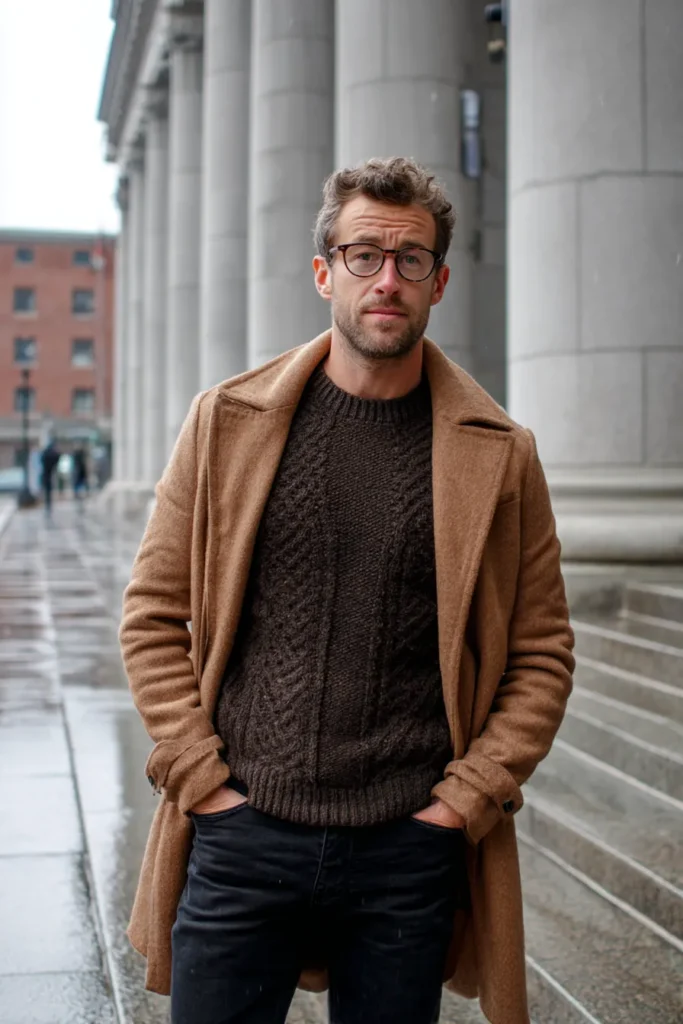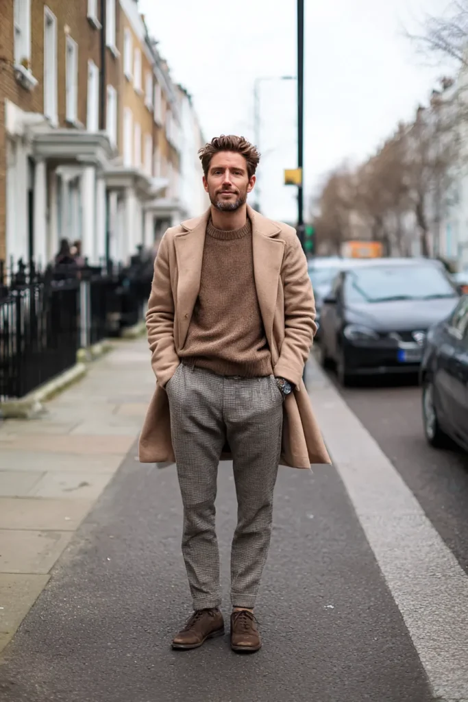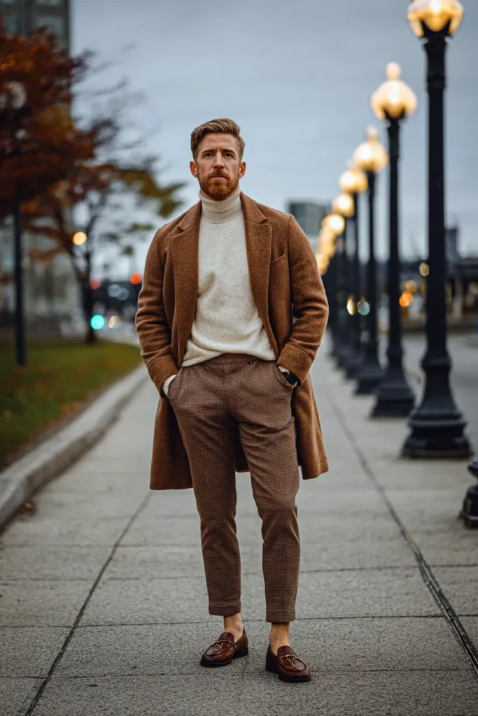 This sophisticated look is perfect for those cooler days, embracing beautiful, warm brown tones and cozy textures. The centerpiece is a stunning caramel-colored overcoat with a slightly fuzzy texture that looks incredibly luxurious and warm. It’s paired with a thick, creamy white turtleneck underneath, which is such a lovely contrast to the coat’s richness. The trousers are a tailored brown with a subtle check pattern, adding a classic menswear print, and the outfit is polished off with handsome, deep burgundy or brown leather loafers.