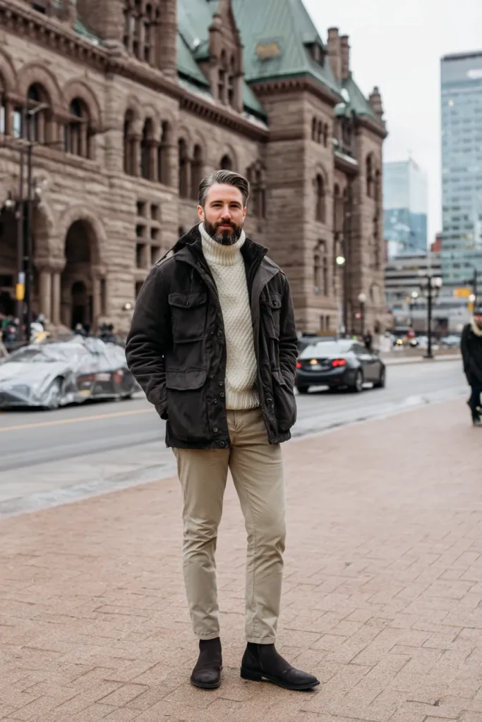 This is a fantastic urban-meets-utility look that’s perfect for colder weather, pairing comfort with a structured style. The outfit features a dark, almost black-brown field jacket or parka with multiple pockets, giving it a cool, slightly rugged feel. Underneath, a thick, cozy cable-knit turtleneck in a creamy off-white color provides a beautiful bright contrast and texture. The bottom half is kept light with tailored chinos in a pale khaki or stone color, and the whole ensemble is grounded by dark brown or black suede Chelsea boots for a sleek, cohesive finish.