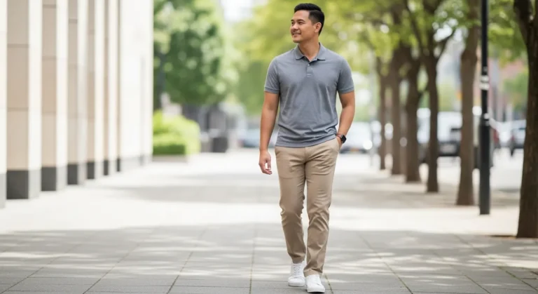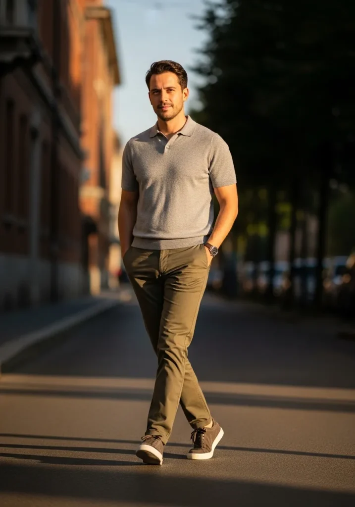 This outfit pairs a light grey short sleeve polo with slim fit beige chinos. The polo looks smooth and breathable with a clean collar that keeps things polished. The chinos sit neatly at the ankle and are styled with casual sneakers for a relaxed city vibe. The overall look feels airy, modern, and very easygoing.