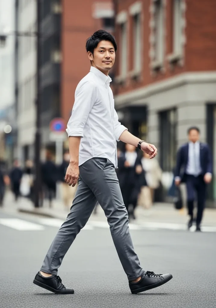 This outfit keeps things sharp with a white button down shirt and slim grey chinos. The clean lines give the outfit a modern tailored feel. Black shoes add contrast and keep the look grounded. The overall style feels sleek and city ready.