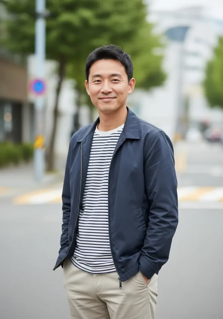 This look features a lightweight jacket layered over a striped tee with beige chinos. The stripes add personality while the jacket keeps the outfit structured. Casual shoes complete the relaxed feel. Everything feels easy and lived in.