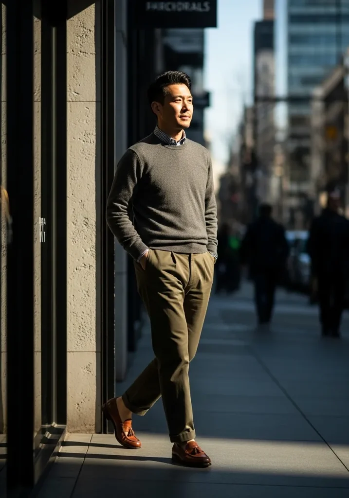 This outfit pairs a dark knit sweater with olive green chinos and brown leather shoes. The sweater adds warmth and texture while the chinos keep the look clean. The color palette feels earthy and calm. The vibe is relaxed but still polished.