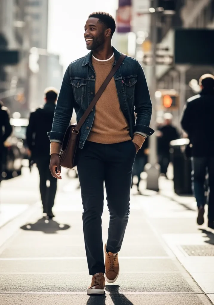 This outfit layers a dark denim jacket over a warm knit top with navy chinos. The jacket adds structure while the knit softens the overall look. Brown leather shoes bring warmth and contrast. The vibe feels modern casual and urban.