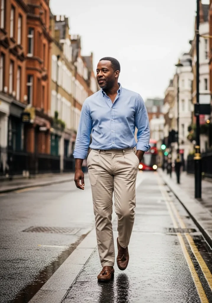 This outfit combines a light blue button down with classic beige chinos. The shirt feels crisp while still relaxed in fit. Brown shoes keep the look grounded and timeless. Everything feels clean and easygoing.
