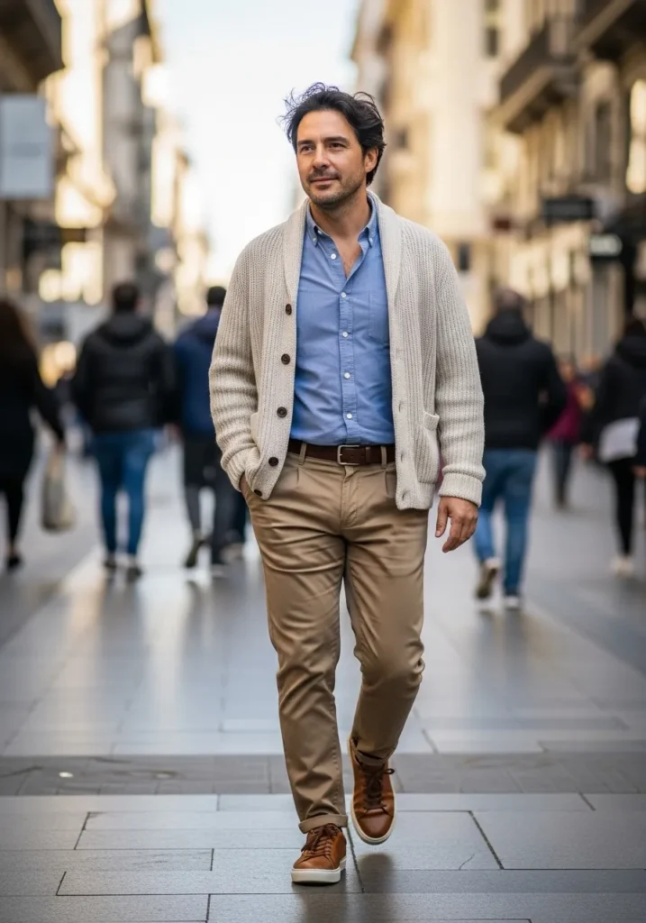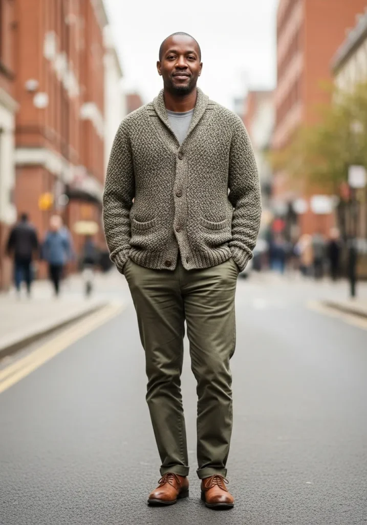 This outfit pairs a textured cardigan with olive chinos and brown leather shoes. The cardigan adds depth and softness to the look. The color palette feels cohesive and warm. The overall feel is relaxed yet intentional.
