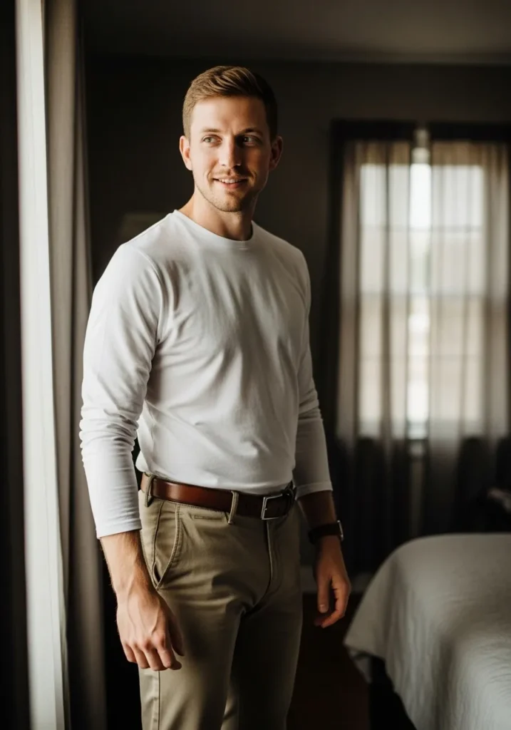Here we have a crisp white long sleeve tee tucked into warm beige chinos. The fit is clean but not tight which keeps the outfit comfortable and modern. A brown belt adds just enough contrast while keeping the look cohesive. The vibe leans minimal with a calm and put together feel.