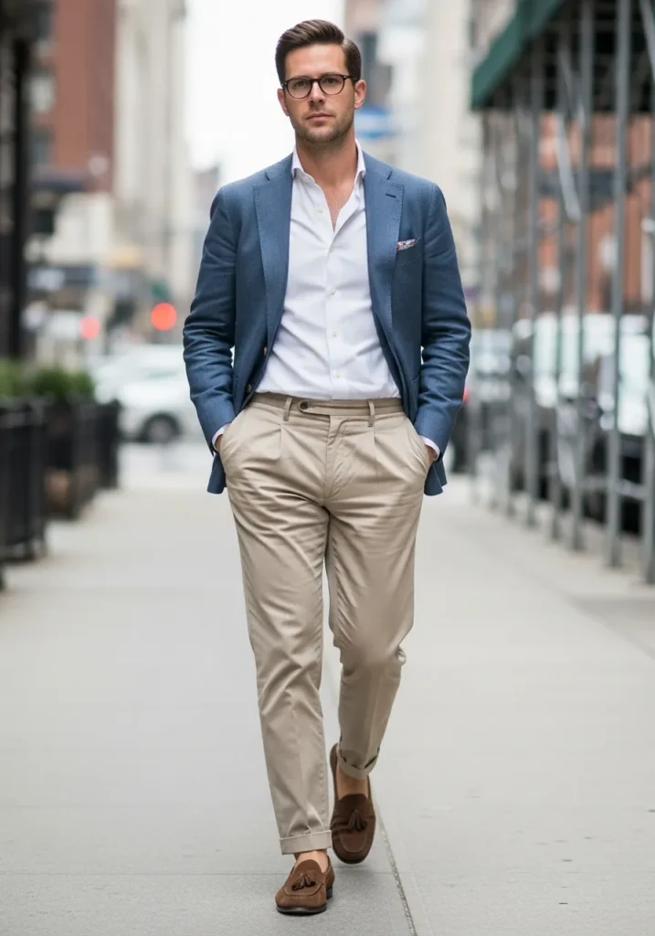 This outfit combines a tailored blue blazer with a crisp white shirt and beige chinos. The blazer adds structure while the open collar keeps things relaxed. Brown loafers complete the look with ease. Everything feels clean and refined.