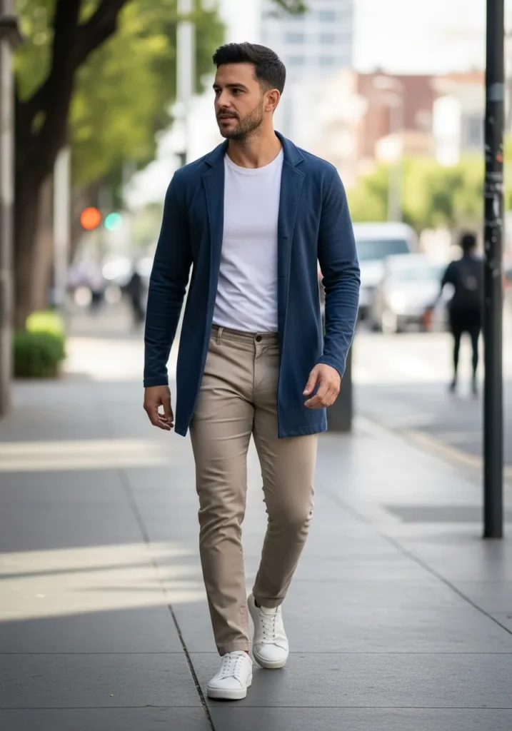This outfit combines a navy blazer with a simple white tee and light tan chinos. The blazer adds structure while the tee keeps things casual and fresh. White sneakers soften the look and make it feel very wearable for everyday life. Everything feels balanced and city ready.