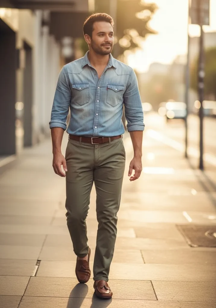 This look features a light blue chambray button down paired with olive green chinos. The shirt has a casual texture that feels soft and broken in. Brown leather shoes add warmth and ground the outfit nicely. The color mix feels natural and easy on the eyes.