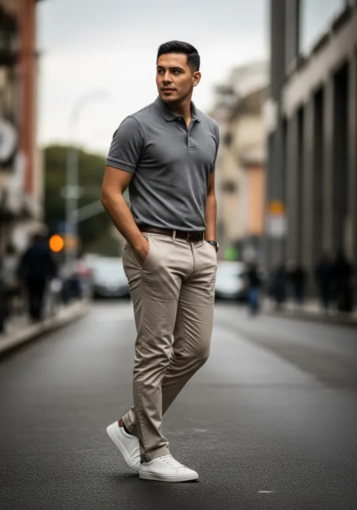 This look pairs a soft grey polo shirt with slim beige chinos. The polo feels breathable and clean with a neat collar that keeps things polished. White sneakers add a fresh casual finish. The outfit feels light balanced and effortless.