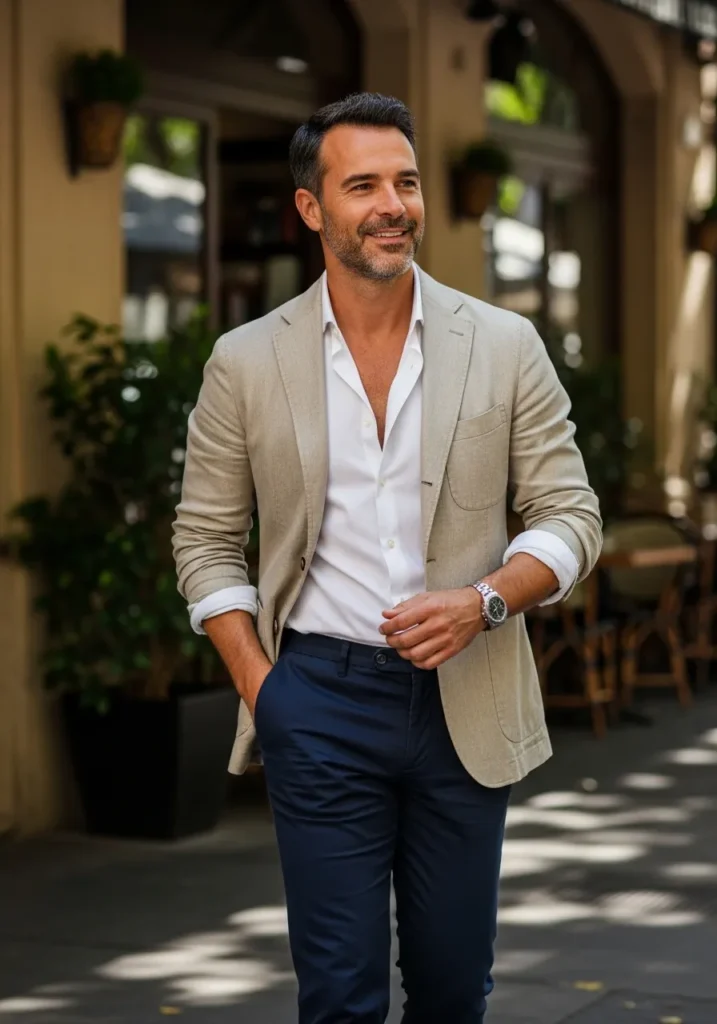 This outfit pairs a soft beige blazer with a crisp white shirt and navy chinos. The blazer adds structure while the open collar keeps things relaxed. Dark loafers finish the look with a polished but easy feel. Everything feels light refined and warm.