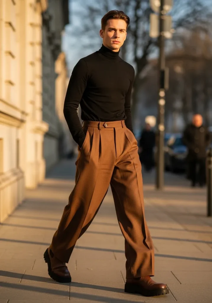 This look is pure fashion energy. He is wearing high waisted wide leg brown trousers with sharp pleats and a structured drape that moves beautifully as he walks. The pants feel tailored yet relaxed, especially paired with a fitted black turtleneck that keeps the top half clean and minimal. Dark leather boots ground the outfit and add weight, while the rich brown fabric catches the golden hour light in the most flattering way. The overall vibe is modern, confident, and slightly European in the best way.