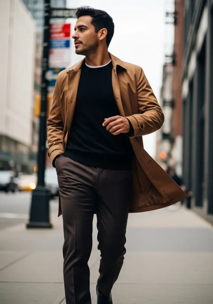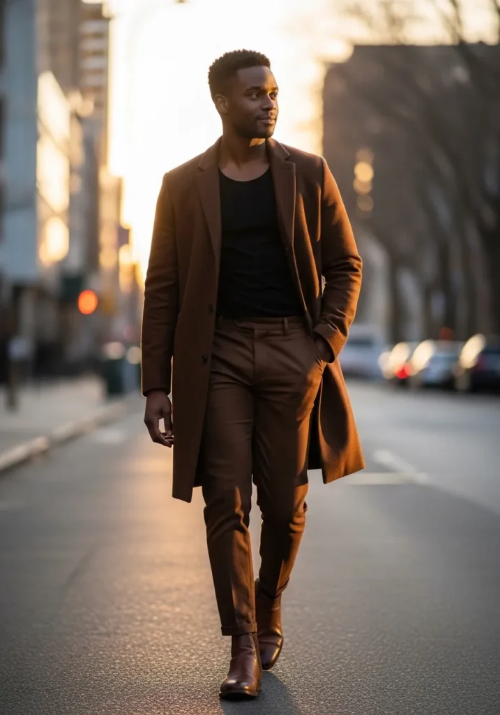 This look feels straight out of a modern city moment. He is wearing slim dark brown tailored trousers with a clean, sharp finish that slightly taper at the ankle. On top, a sleek black crew neck sweater keeps things refined and minimal. Layered over it is a camel coat that moves beautifully as he walks, adding warmth and depth to the outfit. The combination of rich brown tones and classic black creates a polished, urban vibe that feels confident and effortlessly stylish.
