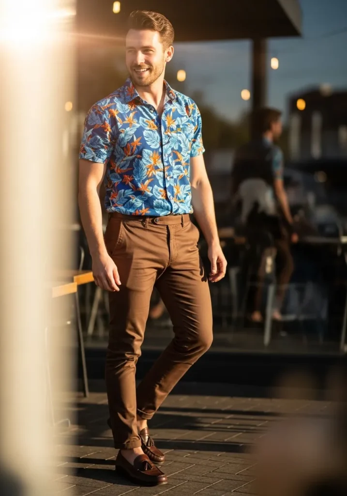 This outfit feels like sunshine in clothing form. He is wearing slim fit brown trousers that sit cleanly at the waist and taper slightly toward the ankle. The fabric looks lightweight and smooth, which keeps the silhouette sharp. On top, a bold short sleeve button up in a vibrant blue with orange tropical prints adds personality and energy. Brown leather loafers ground the look and keep it polished instead of overly casual. The overall vibe is relaxed but stylish, perfect for warm evenings out.