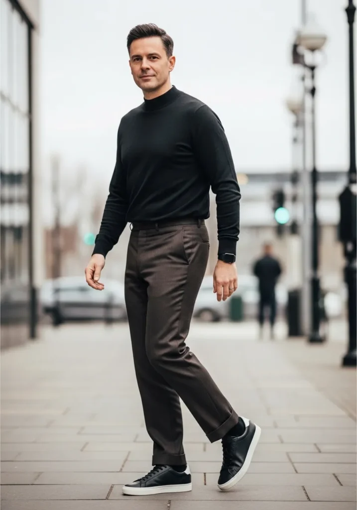 This outfit is clean, sharp, and quietly powerful. He is wearing tailored brown trousers with a subtle sheen and a neat cuff at the hem, giving the pants a structured and modern shape. The fit is streamlined without looking tight, which keeps everything polished. On top, a fitted black mock neck sweater adds a smooth contrast and creates a refined silhouette. Black leather sneakers finish the look with a contemporary edge that feels city ready and effortless.