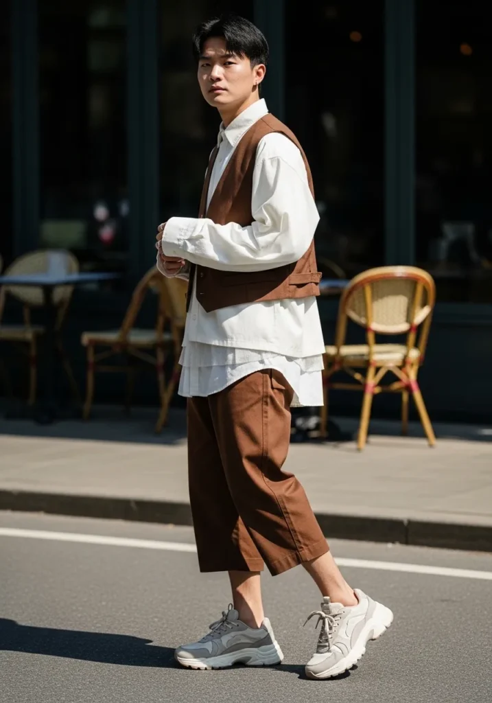 This outfit feels playful and fashion aware in the best way. He is wearing cropped brown trousers with a relaxed straight leg that shows a bit of ankle for a modern silhouette. The fabric looks structured yet comfortable, giving the pants shape without stiffness. On top, a crisp white button down shirt is layered under a rich brown vest that adds dimension and contrast. Chunky light gray sneakers bring in a sporty edge and keep the look fresh and current. The whole vibe feels creative, youthful, and very street style inspired.